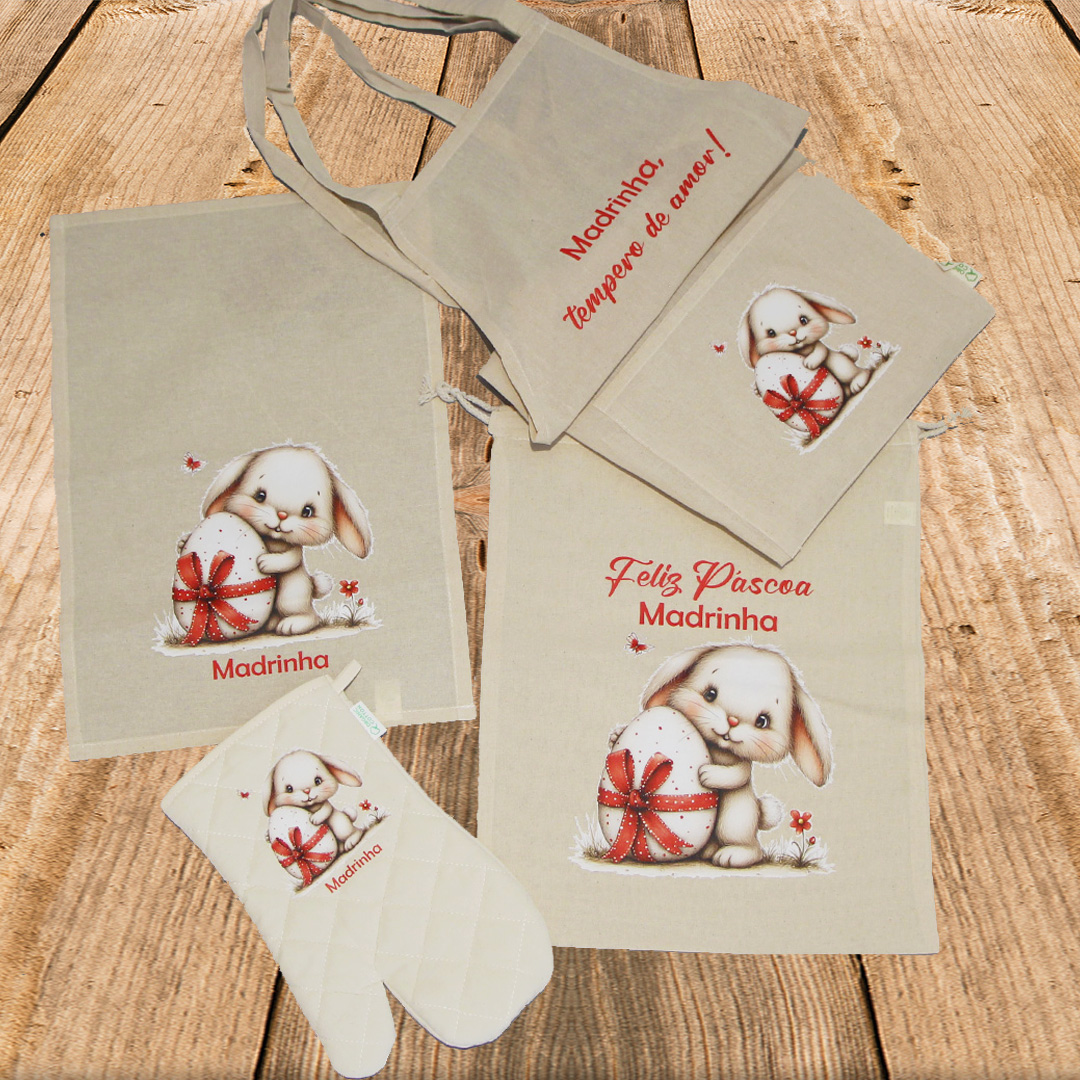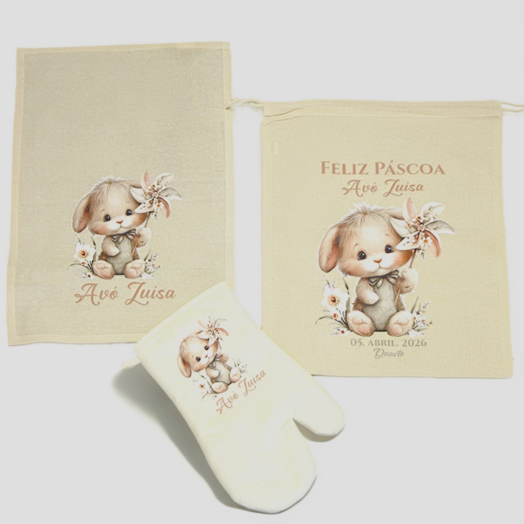 Para surpreender as madrinhas, as avós ou quem quiseres com um conjunto de Páscoa personalizado cheio de carinho. Este conjunto inclui saco, avental, pano e luva de cozinha com uma adorável ilustração de coelhinho e possibilidade de personalização, tornando-o um presente único e especial.