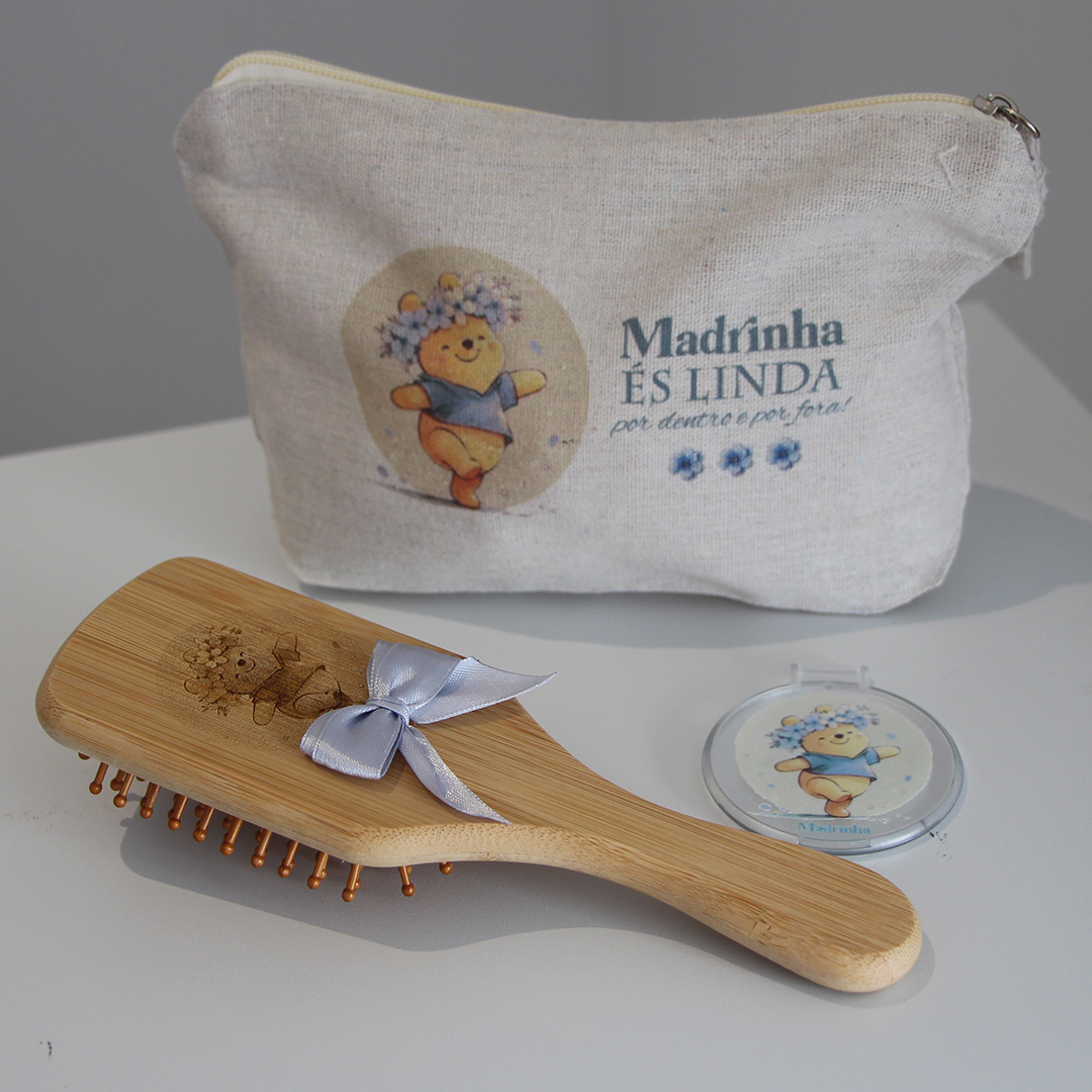 Necessaire personalizada com escova de cabelo, bálsamo e espelho. Um presente prático e especial para madrinha, perfeito para surpreender com um detalhe único. Se tiveres dúvidas manda-nos mensagem para o Whatsapp 913795567