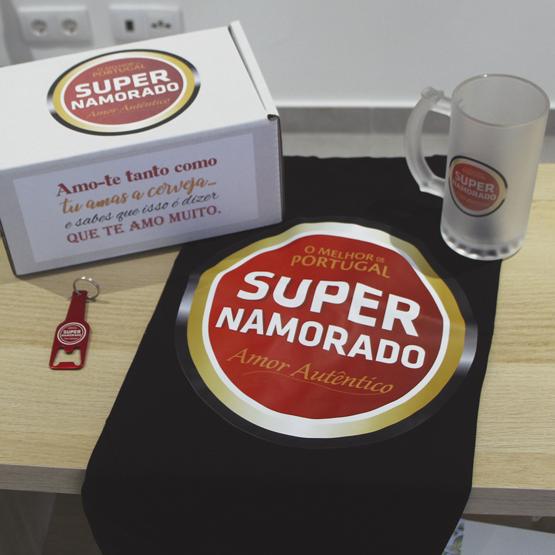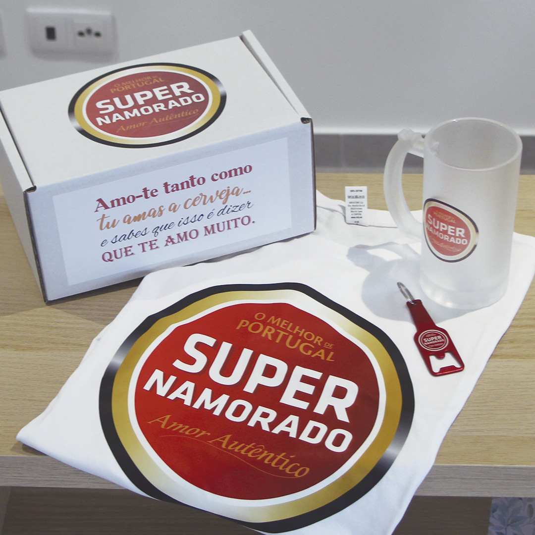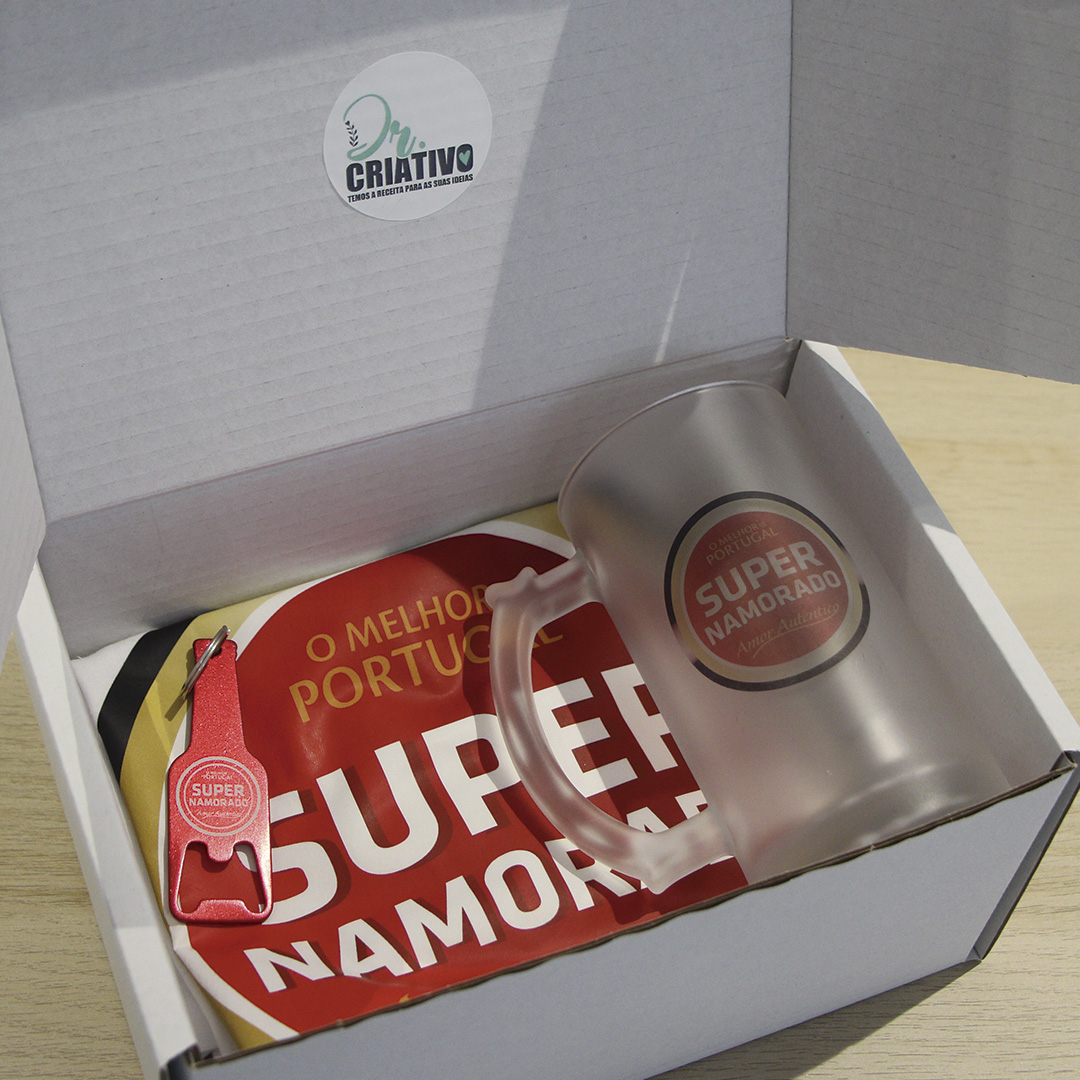 Esta caixa é composta por 1 caneca de vidro personalizada, uma t-shirt e um porta chaves abre caricas para os Super Namorados