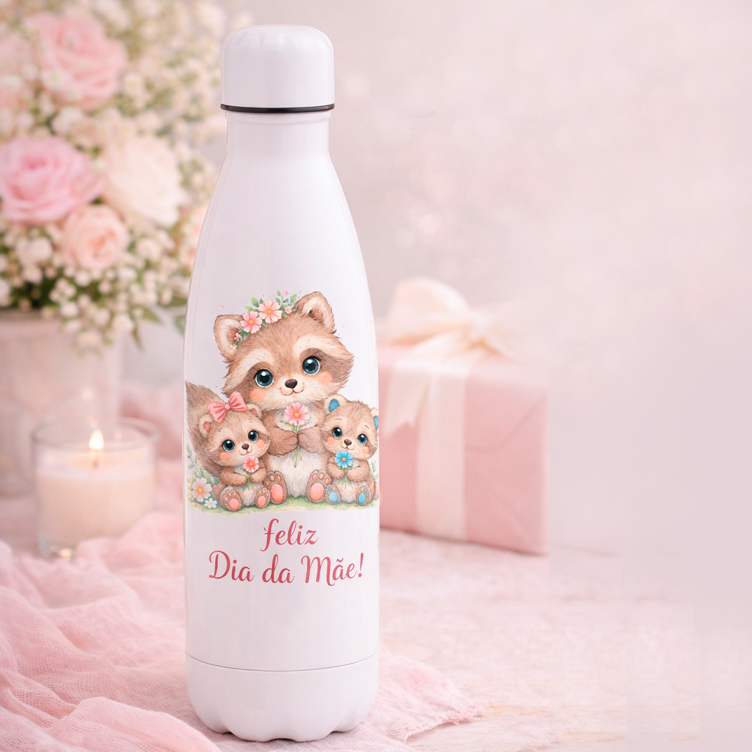 Surpreenda no Dia das Mães com uma garrafa térmica personalizada, linda e funcional! Design fofo com ilustração delicada e mensagem especial. Ideal para presentear com amor. Compre agora!